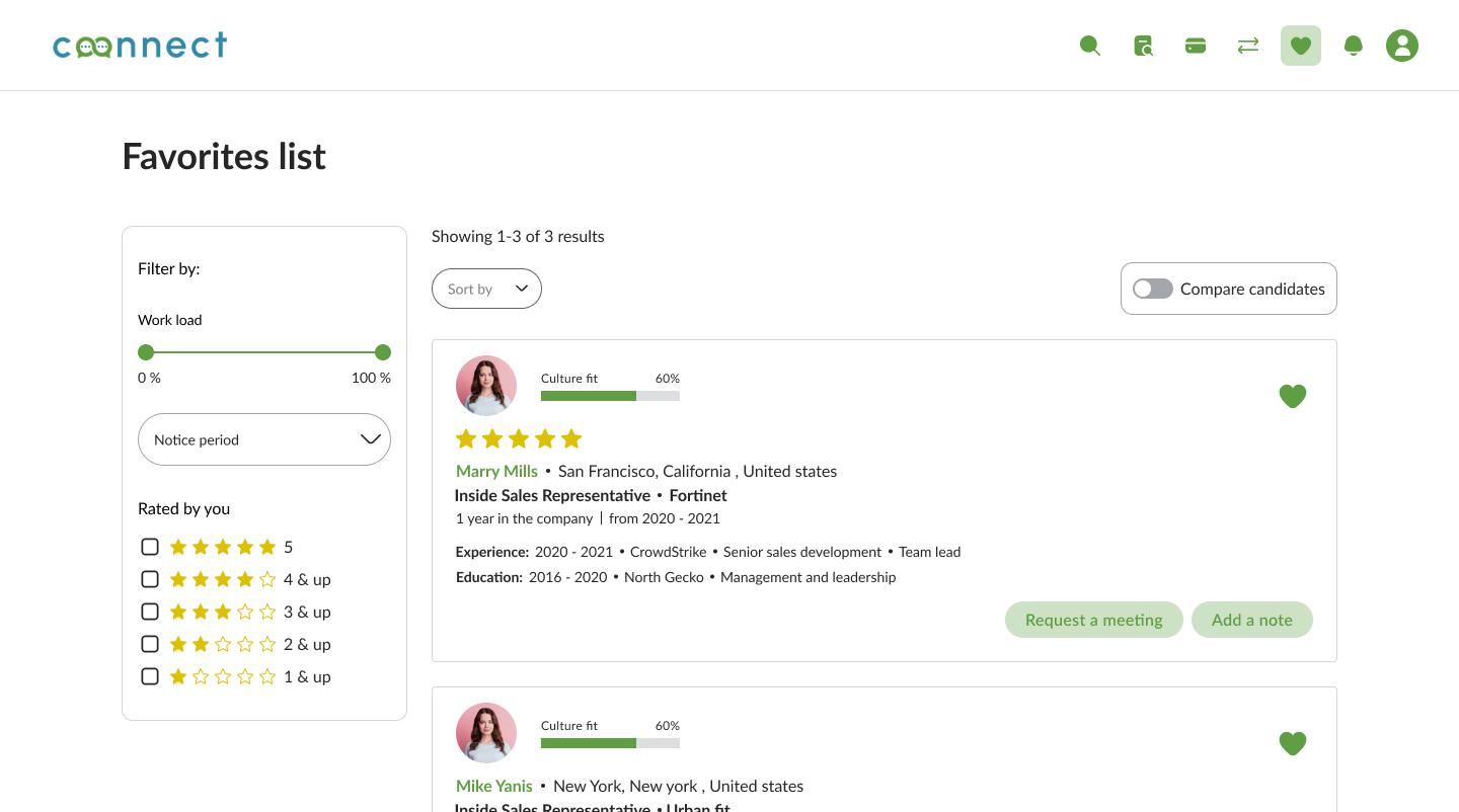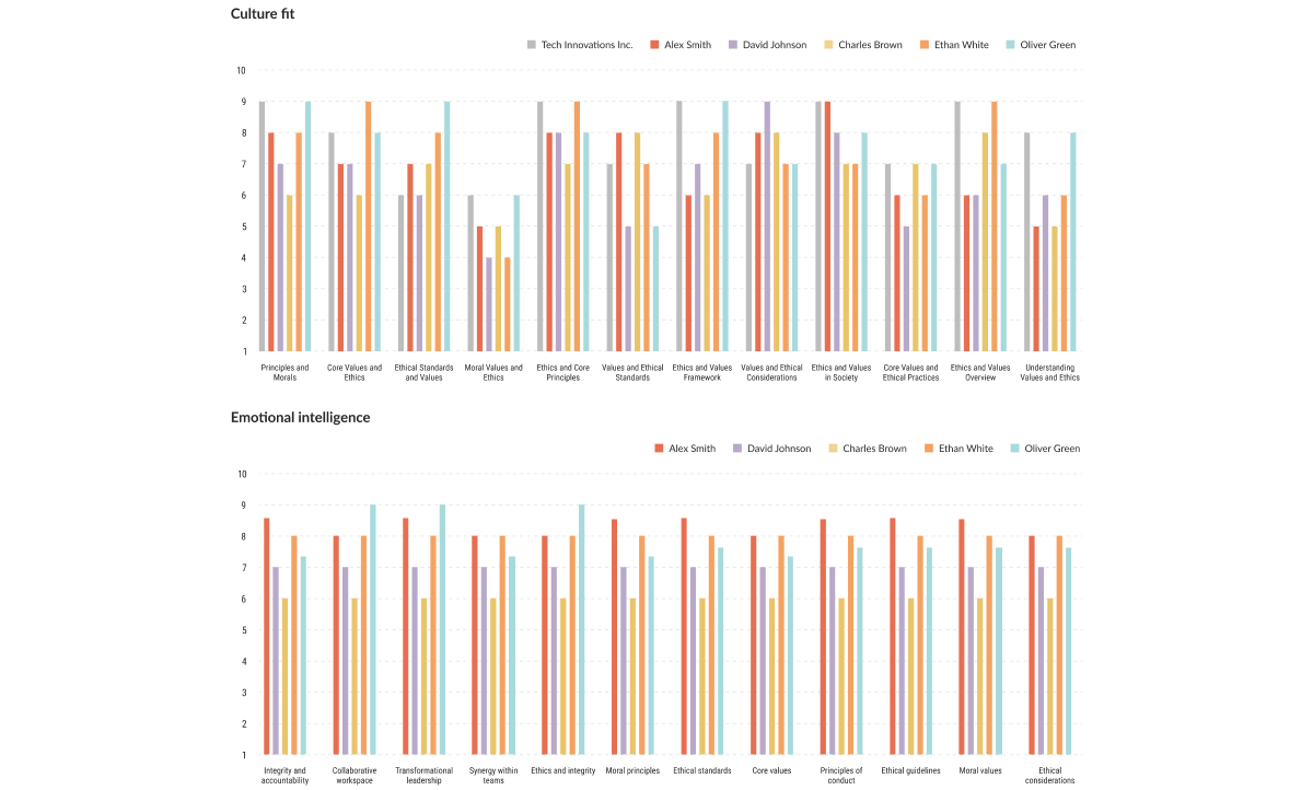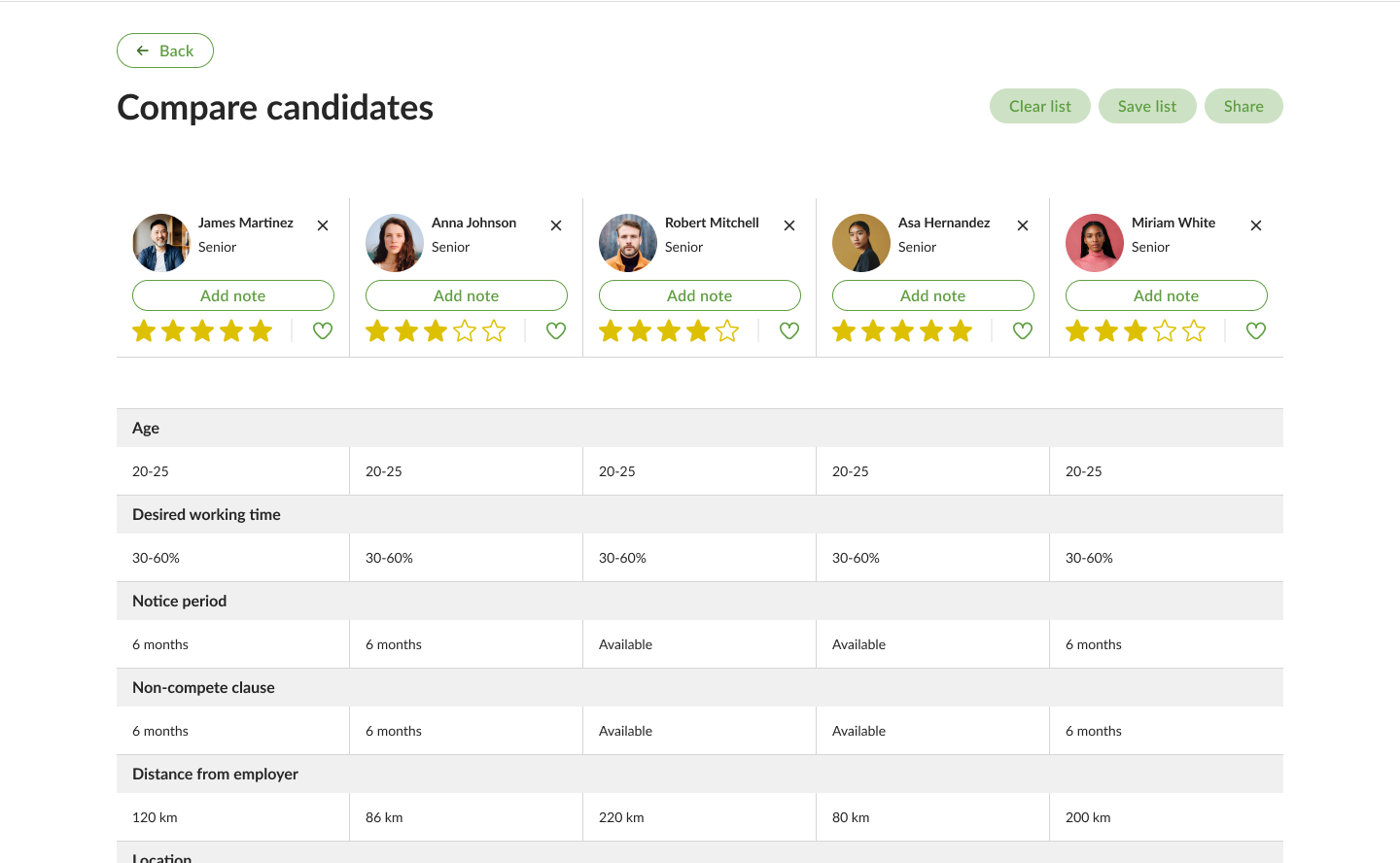 When comparing candidates, we wanted to strip data to its core. Our users tend to have medium attention span, not just numbers. We created a side-by-side view for up to 5 candidates, useful for comparing features like business fit, mindset, and professional skills. Although users initially requested the ability to compare up to 10 candidates, user testing showed that anything beyond 5 causes cognitive overload.