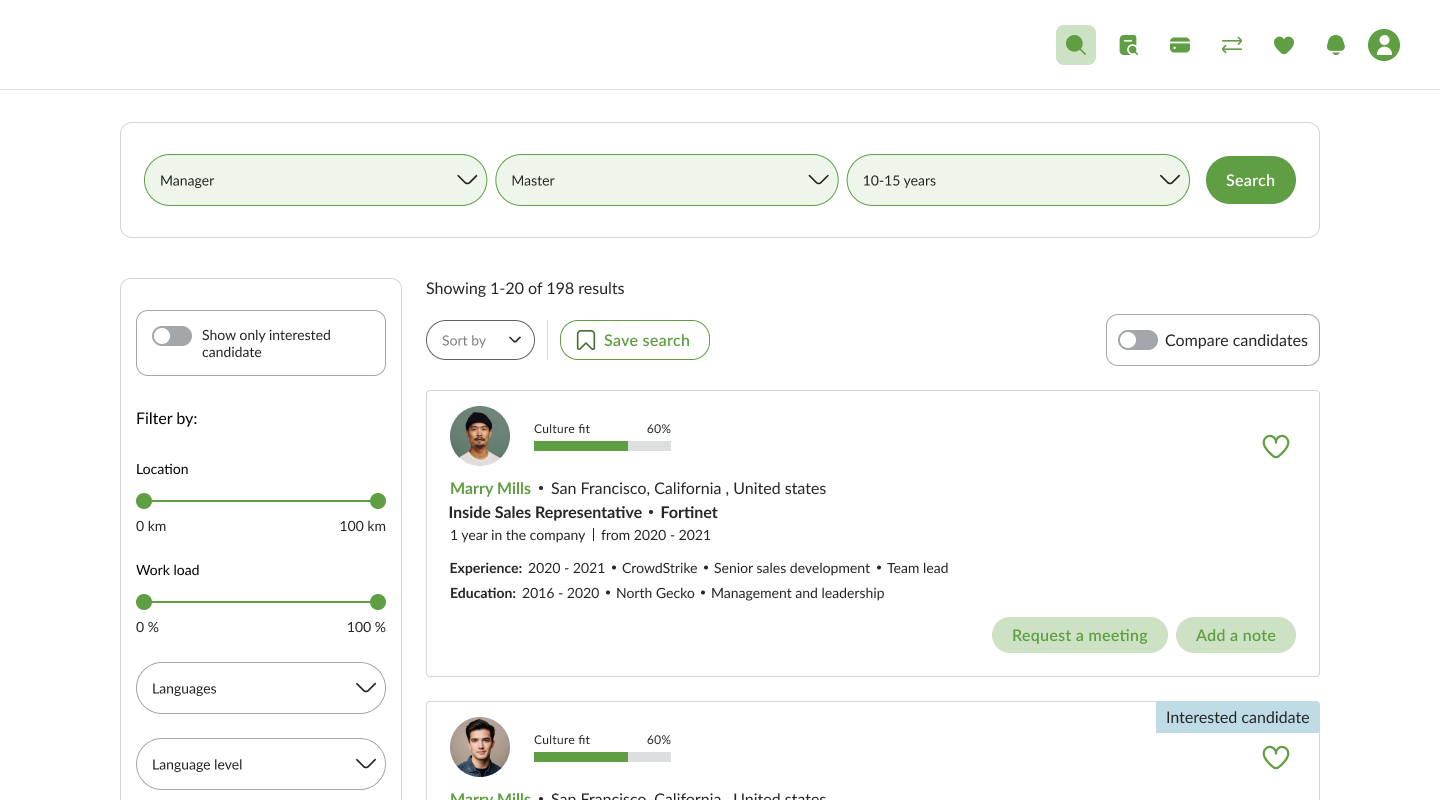 The candidate search module was designed based on patterns people use every day. The goal was not to teach recruiters a new tool but to actively guide them to what works. We enabled access to every choice from the search result itself via functions, notes & labels, invite to team, and the ability to save successful browsing routines when work in multiple tabs and directions.